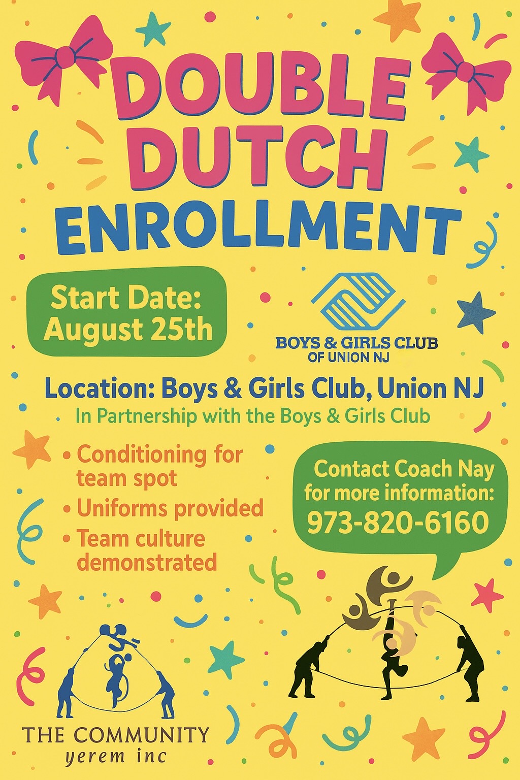 Welcome to THE COMMUNITY YEREM Inc. a nonprofit organization dedicated to nurturing the potential of youth girls ages 7-17 through weekly programs that build confidence, character, and community. From Double Dutch conditioning to leadership workshops, we're here to uplift, empower and support the next generation.